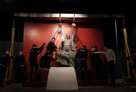 中華世紀壇藝術館的“三國志——文化主題特展”工作人員就是通過這樣的方式將這座千斤重的關公像成功安放的。